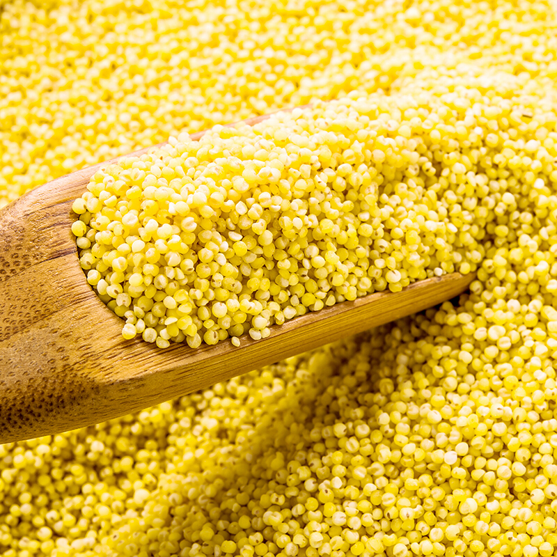 小米的體積較小,呈黃色圓形球狀,與鳥餌非常相似。它具有高營養含量及最少過敏原化合物的易消化鹼性顆粒,並且富含維生素乙複合物和蛋白質,小米其纖維含量同時有利於體重管理,消化及防止便秘。此外,它所提供的鈣質幫助維持骨骼和牙齒健康,多吃能讓你的皮膚更顯健康及減少皺紋,色素不勻及色素沉澱問題。